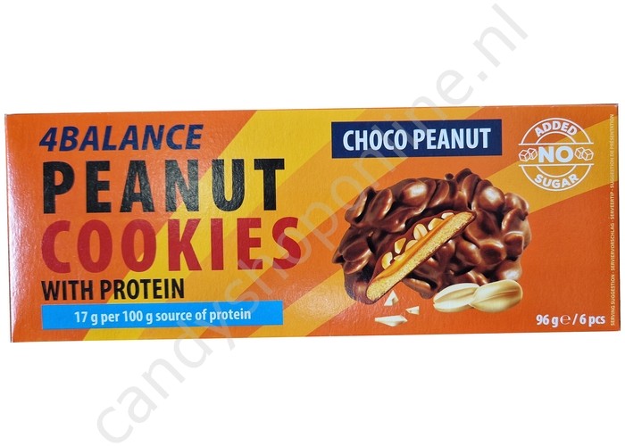 Koekjes met pinda- eiwitcrème en pinda's in melkchocolade zonder toegevoegde suikers.