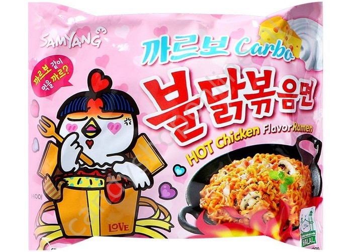 Samyang Instant Ramen Buldak Pittige Carbonara Kippensmaak is een populaire Koreaanse instant noedel die bekend staat om zijn intense kruidigheid. Het heeft een pittige kipsmaak en wordt vaak "vuurnoedels" genoemd vanwege de hoge mate van hitte.